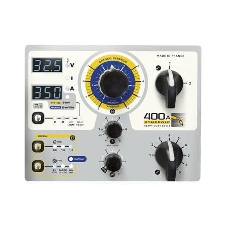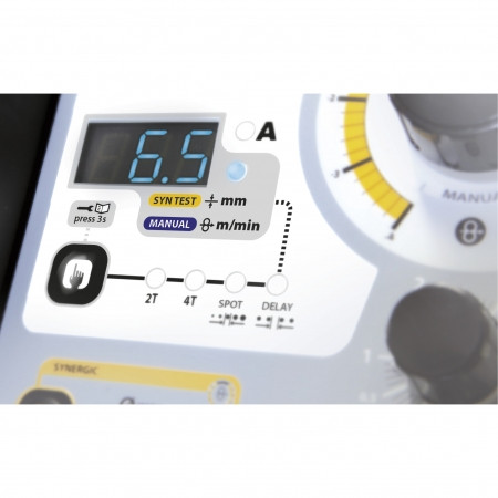- Sélectionner simplement la nature du fil, le diamètre de fil, la puissance, à l’aide des deux commutateurs et l'appareil détermine pour vous la vitesse de fil optimale, le pré-gaz / post-gaz, le burnback