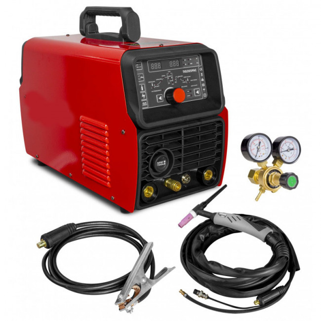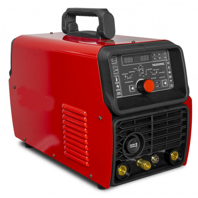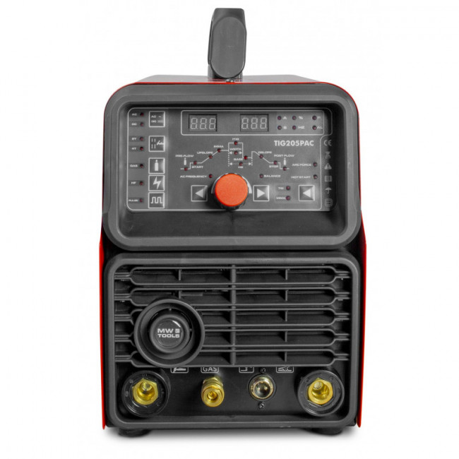 - Affichage digital clair avec réglage de : AC/DC, courant de soudage, pente ascendante et descendante, pré- et post-flow, fréquence des impulsions, équilibre des impulsions