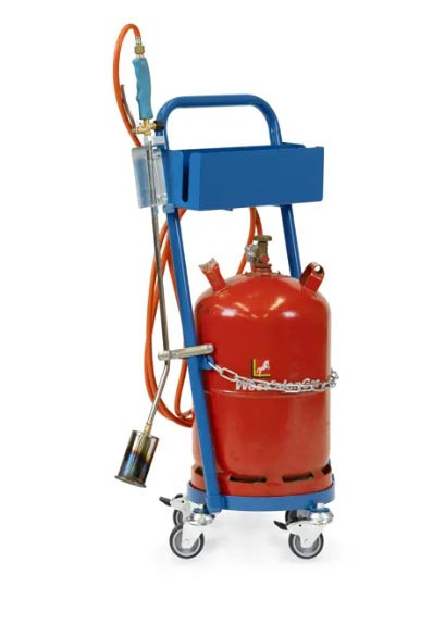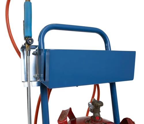 Rouleur de bouteilles avec chaîne de maintien et poignée d'accrochage du tuyau et support de pistolet à gaz et appareil à flammes.