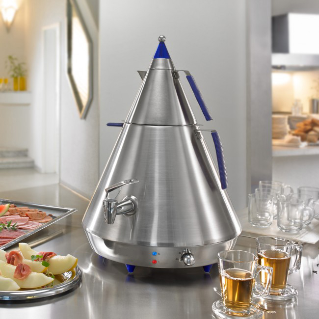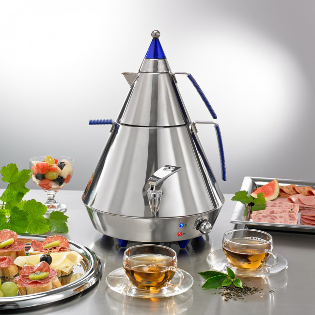 Ce samovar à thé est d’une capacité de 4 litres et d’une puissance totale de 2 500 watts.