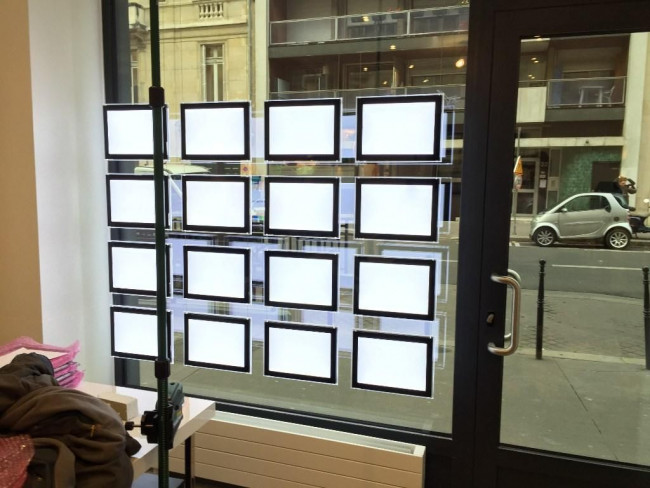 Porte affiche Led pour agencement de vitrine pour agence immobilière, agence de voyage, agence d'interim, banque et assurance. Modele 2020 disponible au format d’affichage A4, A3, A2, A1 et A0 en mode portrait ou paysage.