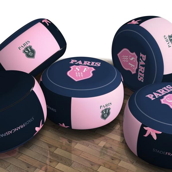 Un fauteuil gonflable aux couleurs de notre entreprise, avec logo sur le dossier et nom+prénom au dos
