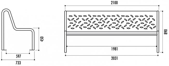 Longueur : 2100 mm Hauteur d'assise : 450 mm Acier perforé, finition peinture oxyron À fixer sur sol dur sur platine