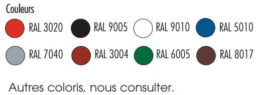 Tout Rouge (RAL3020) Noir (RAL9005) Blanc (RAL9010) Bleu (RAL5010) Gris (RAL7040) Rouge pourpre (RAL 3004) Vert (RAL 6005) Marron (8017)