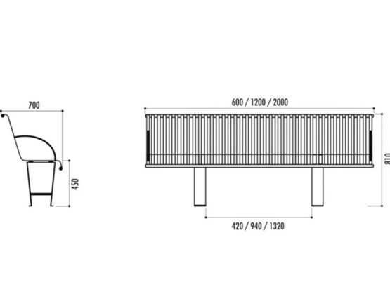 Longueur : 600, 1200 ou 2000 mm Assise et dossier en fer plat 30 mm, épaisseur 4 mm Piètement en fer plat 80 mm, épaisseur 8 mm À fixer au sol par visserie (non fournie) ou par pattes de scellement (non fournies)