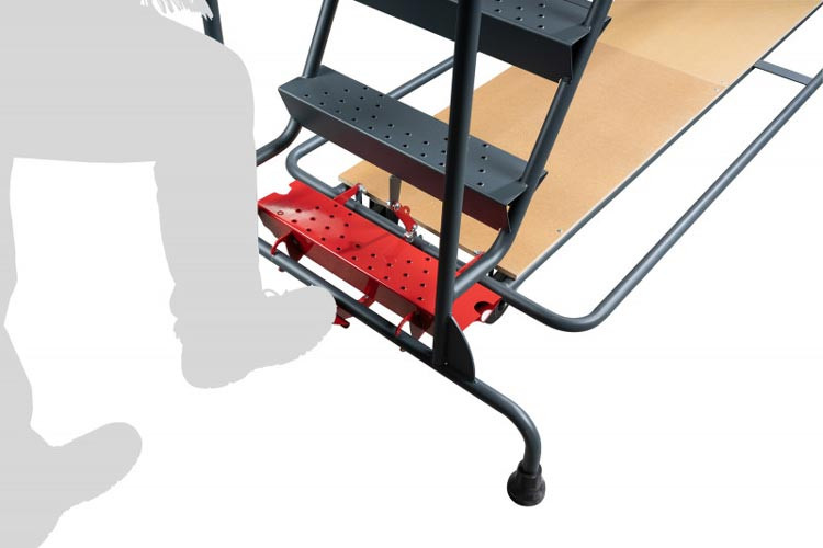 Cette innovation brevetée transforme votre plateforme de travail mobile en poste fixe dès que vous posez le pied sur la première marche.
