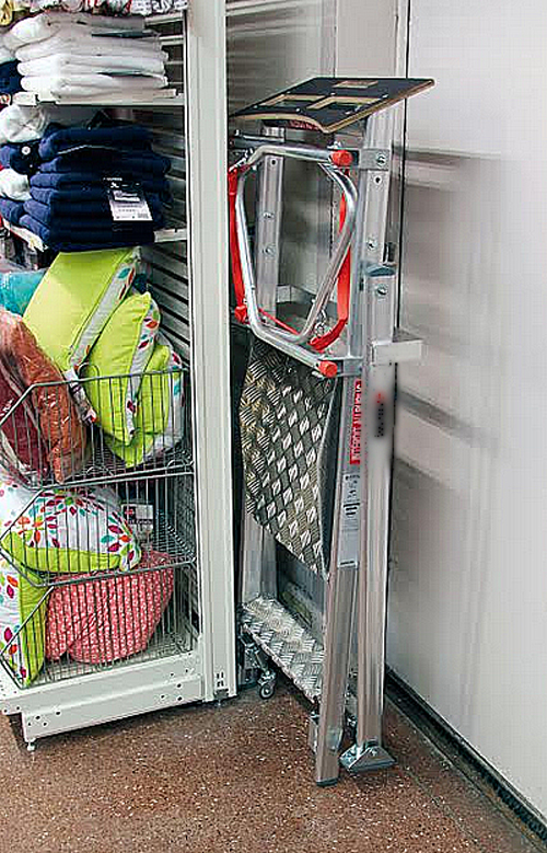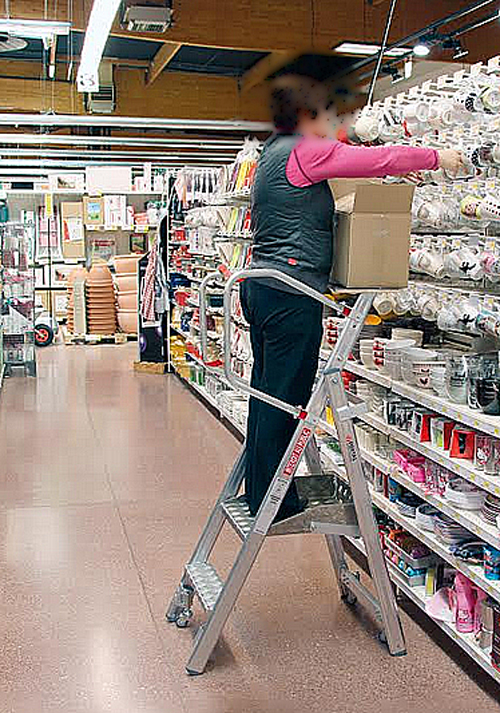 Cet escabeau permet d'éviter les mauvaises postures des personnels lors des phases de mises en rayon.
