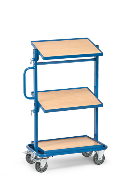 Équipée de 3 plateaux inclinables de 15° et 30° en mélaminé et de 2 roues fixes et 2 roues pivotantes à bandage TPE, moyeu à roulement à billes.