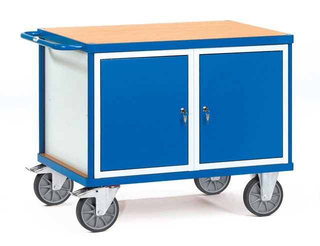Équipée de 2 placards verrouillables avec portes et 1 étagère fixe et 2 amovibles.