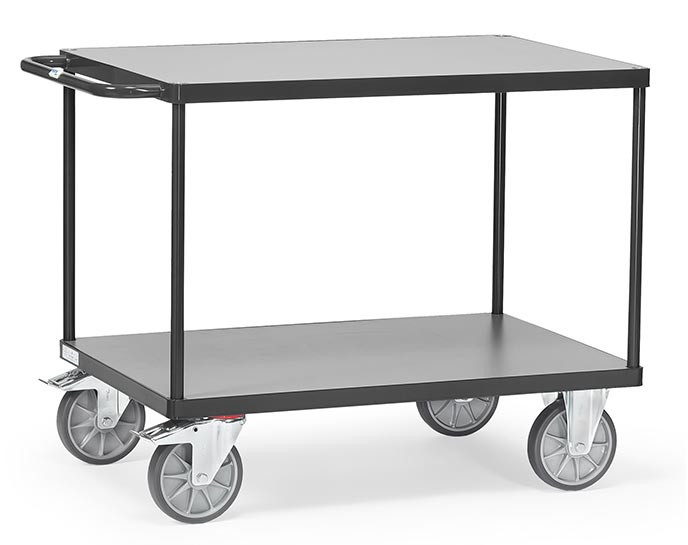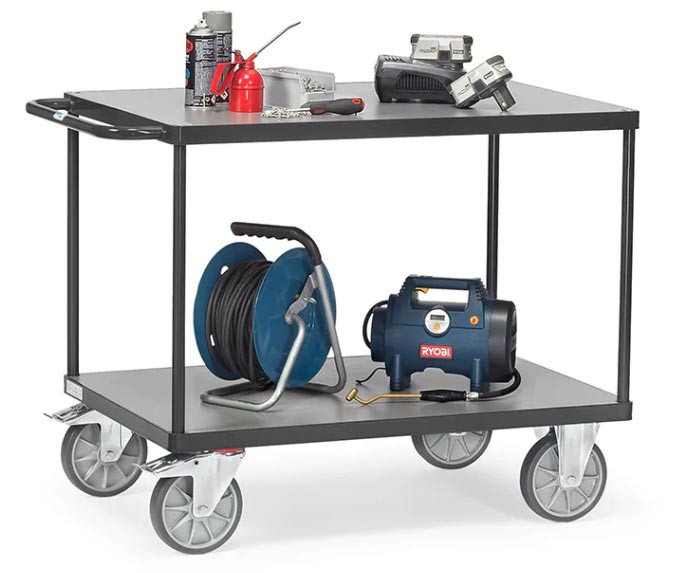 Cette servante d'atelier avec 2 plateaux en bois est spécialement conçue pour le transport de charges lourdes.
