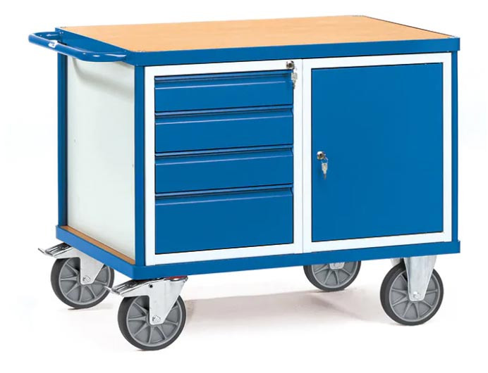 - Plateaux en bois, 1 placard verrouillable en tôle d'acier (H X L X P : 600 x 500 x 700 mm) avec porte et 1 étagère fixe et 2 amovibles.