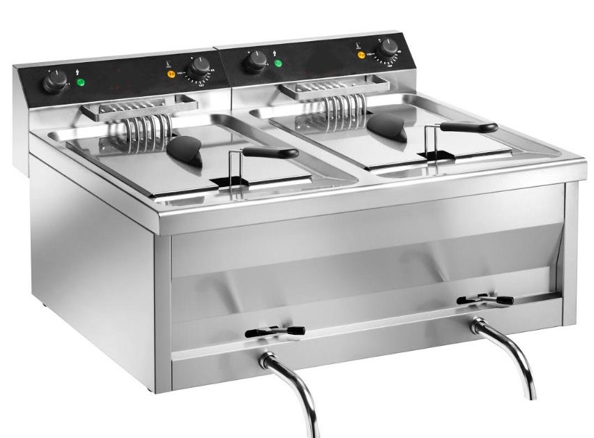Friteuse professionnelle2bacs avec robinet de vidange avec une capacité de 9 litres.