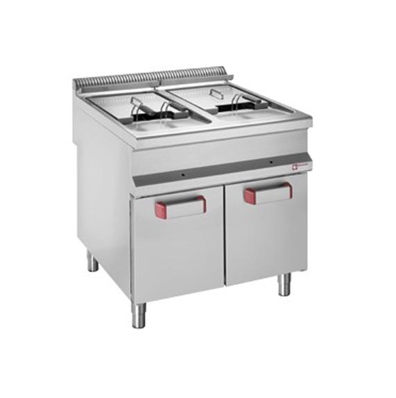 La friteuse est munie de deux cuves de 20 litres, configurée sur une armoire à portes battantes dans laquelle vous pouvez placer vos produits et les garder à la portée de main.
