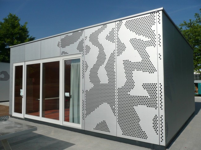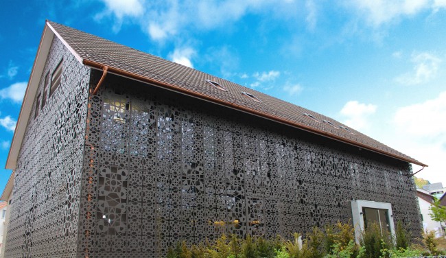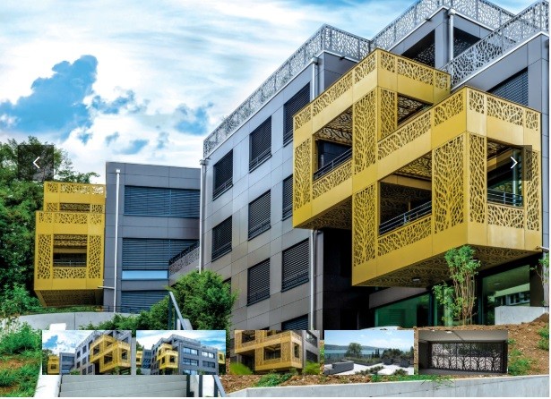Bardage en Cellon® (HPL) pour façades ventilées, perforation décorative par laser.