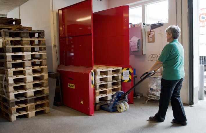- La manipulation s'effectue au niveau du sol. Les palettes s'insèrent dans l'appareil en utilisant un transpalette à main, un empileur électrique ou un chariot élévateur grand format.