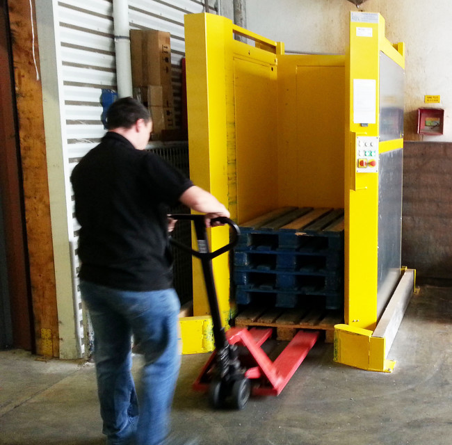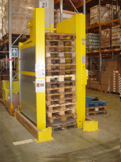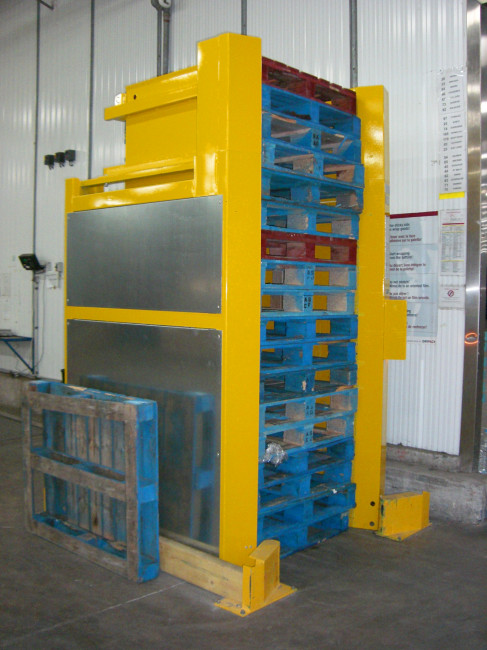 Avec le MAGAPAL®, l'opérateur introduit une pile de palettes dans l'appareil et à chaque déclenchement de cycle, la palette la plus basse est libéré pour une reprise au transpalette.