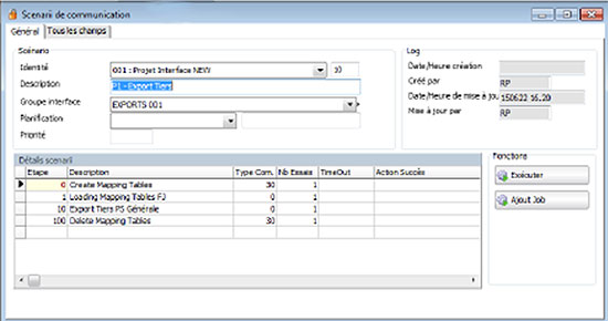Il est possible via des scenarii d’associer les éléments d’une base de données SQL entre eux ou entres différentes bases de données, de réaliser des imports/exports, d’échanger des fichiers via des serveurs distants, d’envoyer des mails ou encore d’exécuter des commandes SQL ou Shell (pour Windows). L’objectif étant de dessiner des interfaces au moyen d’un seul et unique point d’entrée, construire un flux de données complexe et gérer les actions à réaliser en cas d’erreur comme l’envoi d’un mail ou le lancement d’un traitement particulier.