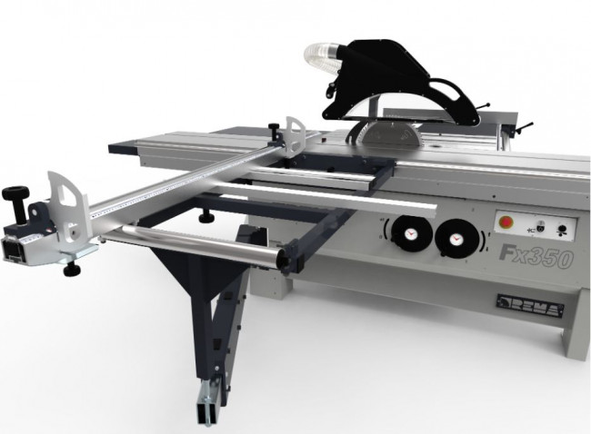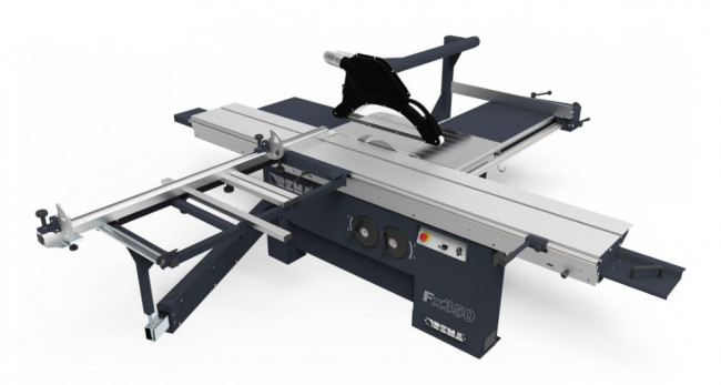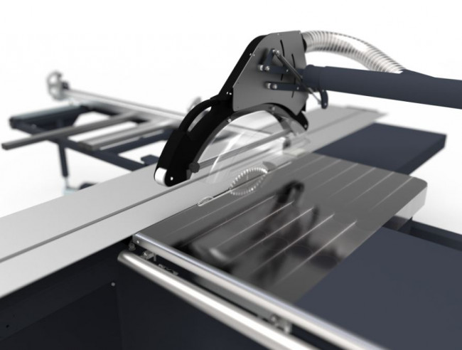 Support de table à tronçonner solide assisté de 6 rouleaux avec fonction de réglage de la hauteur. Longueur table coulissante égale à 3 010 mm en standard. La protection supérieure s'ajuste à la hauteur de la pièce pour assurer la sécurité de l'opérateur. La protection est montée sur le tuyau qui sert d'évacuation de la sciure. Réglage manuel de la hauteur et de l'inclinaison de la lame de scie principale avec indicateurs inertiels. Berceau en fonte avec hauteur et angle de sciage réglable. Diamètre de la lame de scie principale 350 mm, diamètre de la lame de l'unité d'inciseur 120-125 mm. Groupe de coupe monté sur arcs en fonte avec moteur principal de 3,9 kW (option 6 kW) et moteur inciseur de 0,75 kW. Profilé aluminium multichambre largeur 416 mm avec 4 galets acier et 12 galets excentriques. Lecteur électronique de la butée du guide transversal avec fonction de mémoire absolue et précision de 0,1 mm (en option). Lecteur électronique de la butée du guide parallèle avec fonction de mémoire absolue et précision de 0,1 mm (en option).
