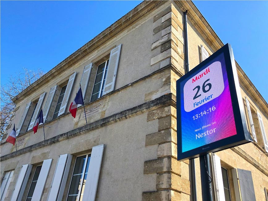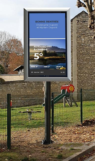 Personnalisation : Les écrans peuvent être personnalisés aux couleurs de la collectivité, renforçant ainsi l’identité visuelle de la mairie.
