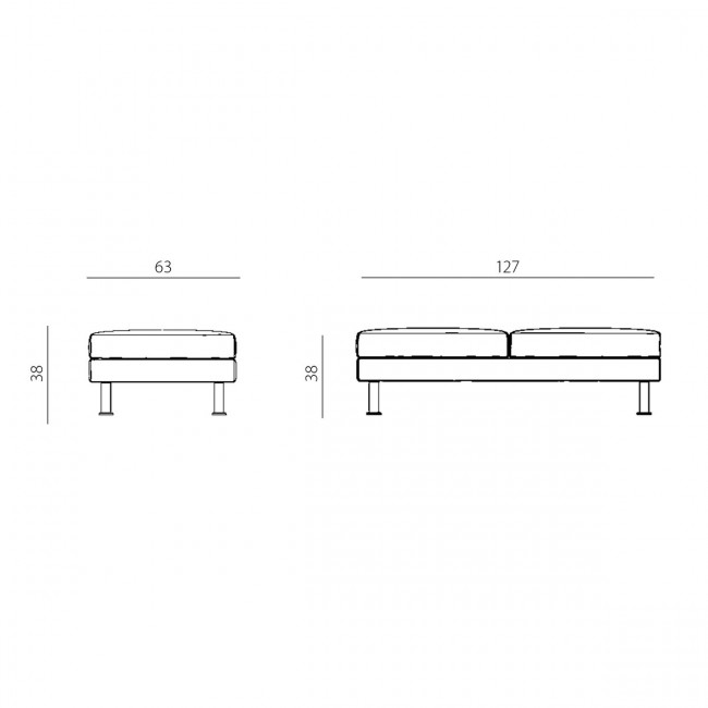 Il est disponible avec des pieds en acier chromé. Plusieurs gammes de tissus sont à votre disposition : Bondai (tissu M1 non feu), Bloom (enduit), Xtreme (tissu M1 non feu) et Laine. Il fait 127 cm de large, 63 cm de profondeur et 38 cm de haut. Sa capacité de charge est de 120 kg/place.