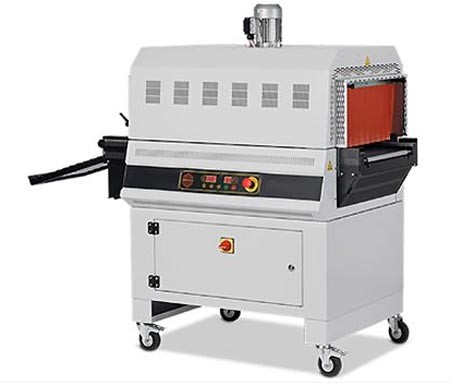 - Tunnel à combiner avec une soudeuse en L semi-automatique ou automatique, pour la rétraction par ventilation à air chaud de toutes sortes de produits conditionnés sous film rétractable.