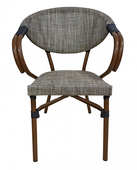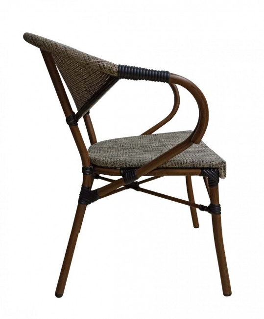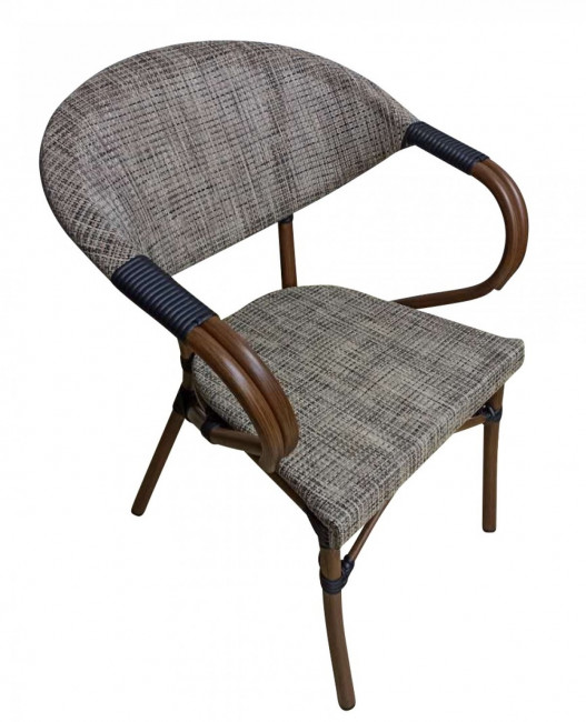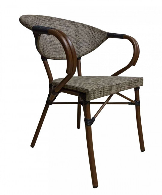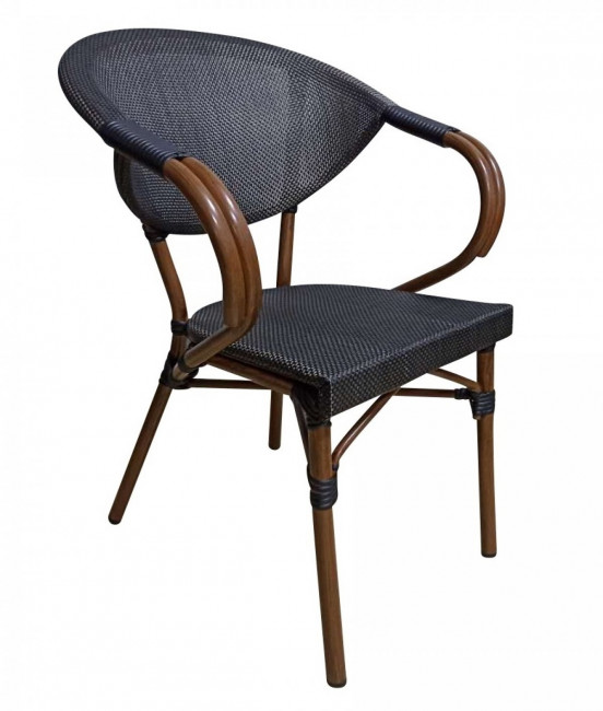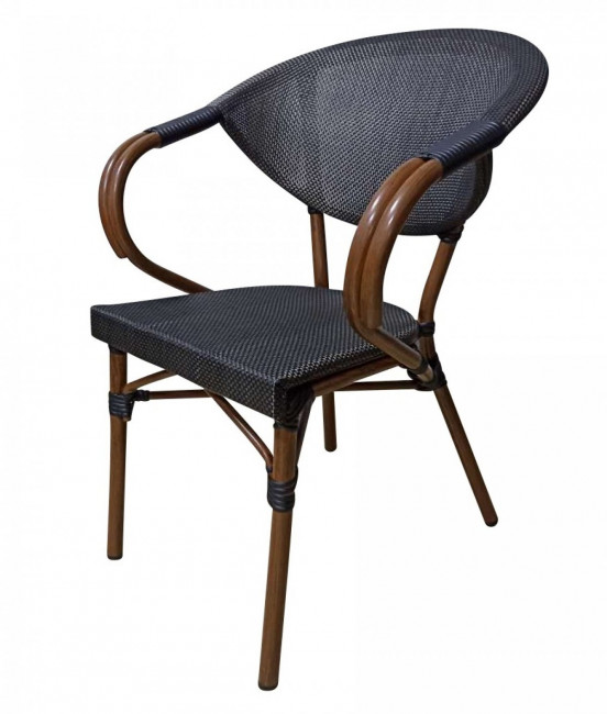 Fabriquée en aluminium effet bambou foncé, avec dossier et assise en tissage textile polyester est confortable et empilable.