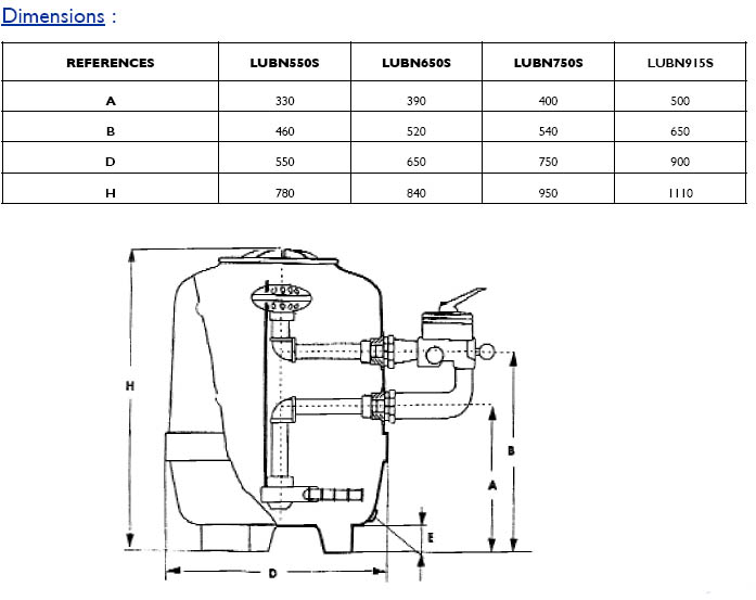 Caractéristiques techniques : • Matière cuve : polyester laminé stratifié • Dôme : polyamide blanc renforcé fibre de verre bouclonnée • Diam. d’ouverture dôme : 22 cm • Purge air : automatique • Vanne : 6 voies side (latérale) avec 1/2 unions • Manomètre : sur la vanne • Pieds : intégrés • Vidange eau : oui • Vidange sable : oui • Pression service : 1.5 bars • Pression d’essai : 3 bars