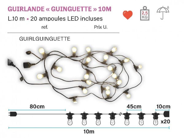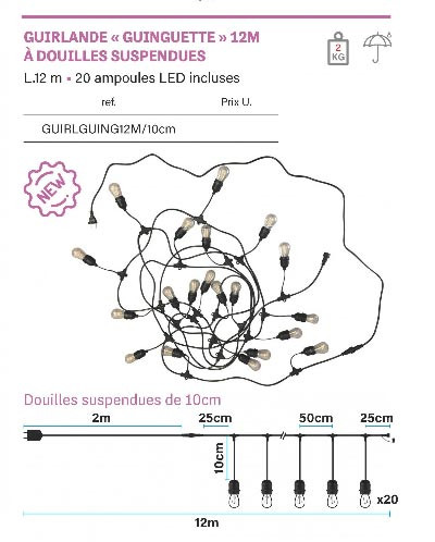 - Equipée de 20 Ampoules LED E27 de 2W, "filaire" fournies