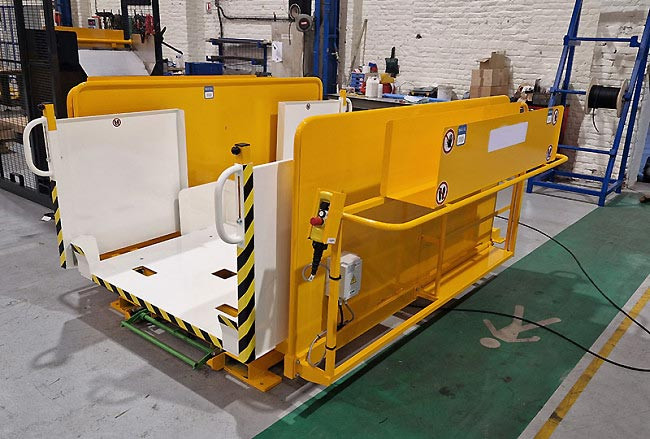 Système verrouillage rotation : verrou mécanique avec déclenchement par pédale - Butée anti-car : tube section 80×80 lg 1160 - Vitesse lente - Arrêt d’urgence - Panneaux latéraux : 2 tôles fixes - Pictogrammes |