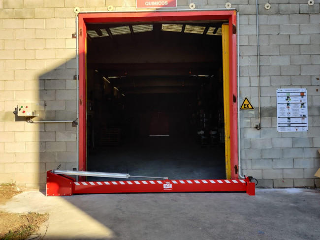 Barrière de rétention des eaux d'extinction d'incendie est un système de rétention étanche laissant libre passage (en position ouverte) pour la circulation des personnes ou le transport des produits jusqu'à ce que se déclare un incendie ou un déversement accidentel, une fuite... Durant cette extinction d'incendie ou lors de la fuite, les barrières (en position fermées) évitent que les eaux polluées et/ou que les produits dangereux e retrouvent en dehors des bâtiments, dans la nature.