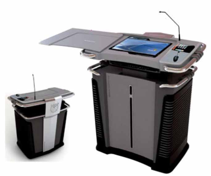 Pupitre tactile pour toutes les salles de classe. • Idéal pour être face aux étudiants durant toute la présentation • Ecran large de 20” avec inclinaison réglable • Amplificateur de 150W • Système de micro sans fil • Ecran LCD tactile de contrôle de 7’’ • Possibilité d’enregistrement des présentations • Lecteur de DVD