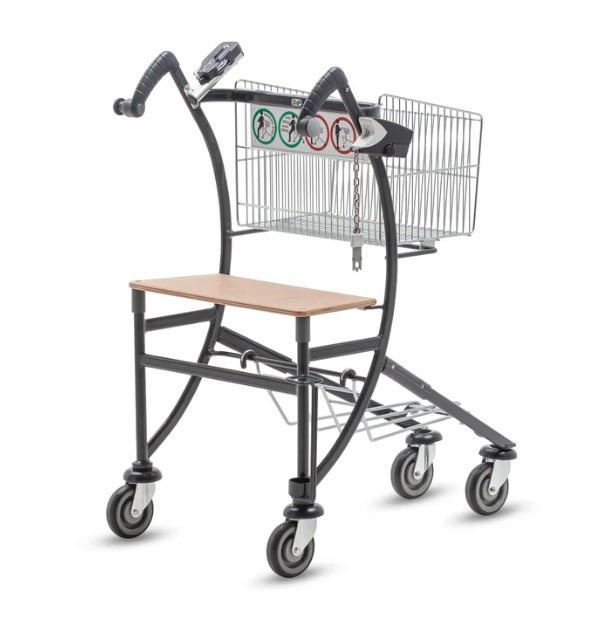 Ce chariot de supermarché est conçu pour accompagner les personnes âgées lors de leurs courses en toute autonomie.