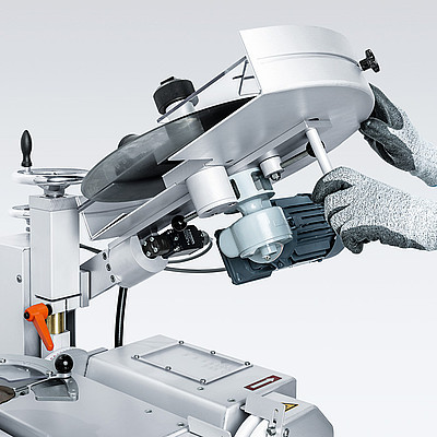 - Lors du changement de couteau, le bras de support est basculé en position horizontale