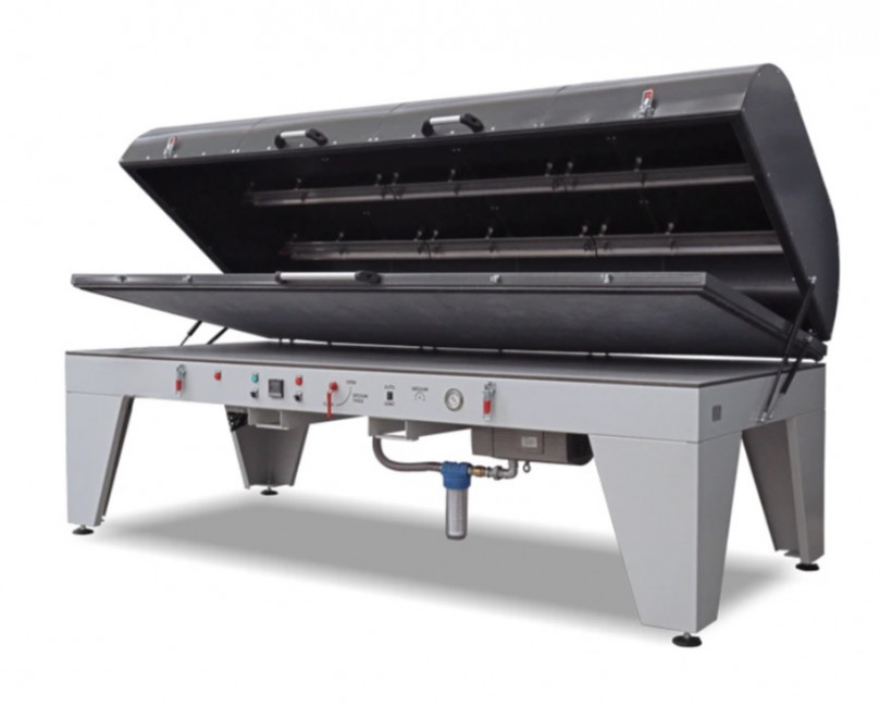 La presse à membrane sous vide avec hotte chauffante est conçue pour des opérations de laminage, placage et cintrage parfaitement maîtrisées.