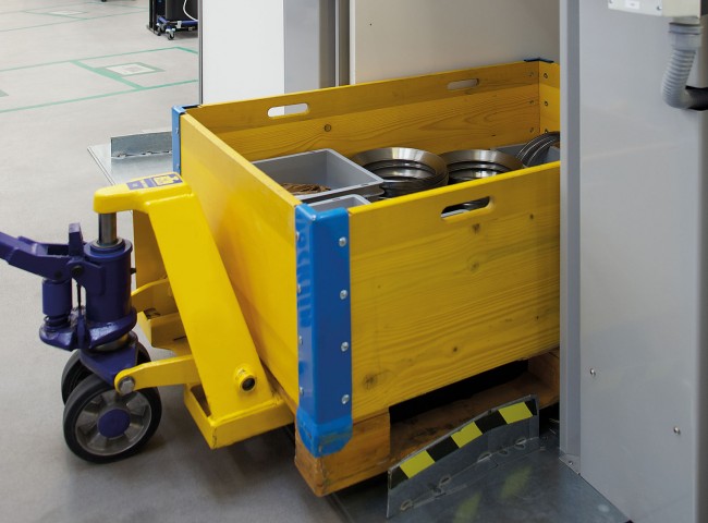 L’opérateur peut introduire lespalettes chargées et les caisses-palettes dans la tour à l’aide d’un chariot élévateur. Le transpalette ou le gerbeur peut également entrer dans le stockeur !