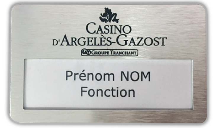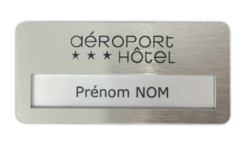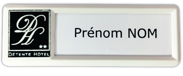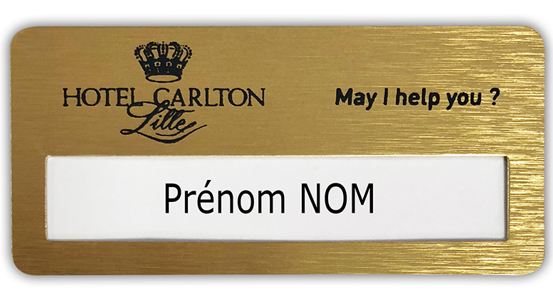 19/06/2025badge personnalisé avec logo de l"hôtel. Avec une fenêtre pour changement des étiquettes prénoms. Taille environ 70*35. Fond couleur doré. Petite quantité 10 unités.