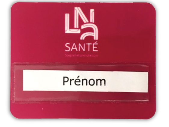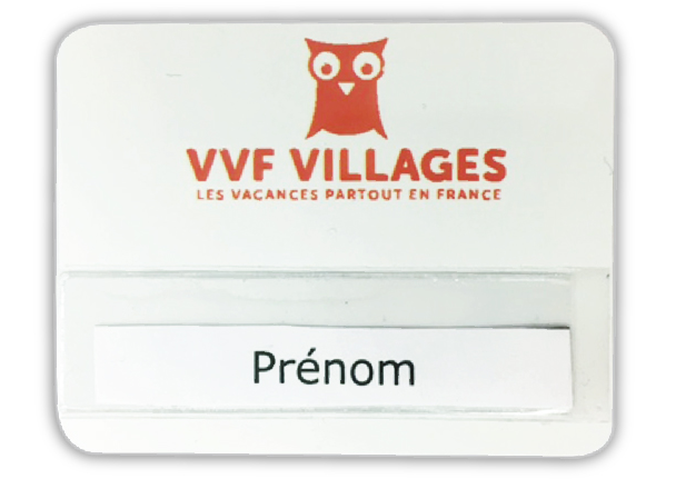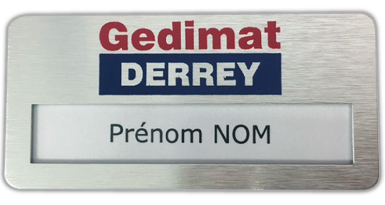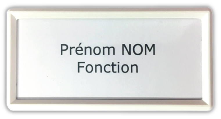 avec notre logo taille 7,5 X 5,5 (ou taille presque similaire) avec place pour Nom et Fonction sur l"étiquette et accroche aimantée