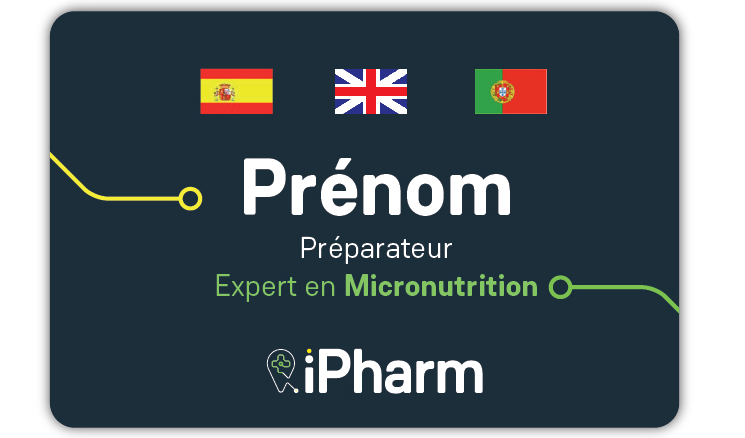 le logo sur la gauche ensuite le prénom en majuscule puis une seconde ligne en dessous pour spécifier pharmacien ou préparateur.