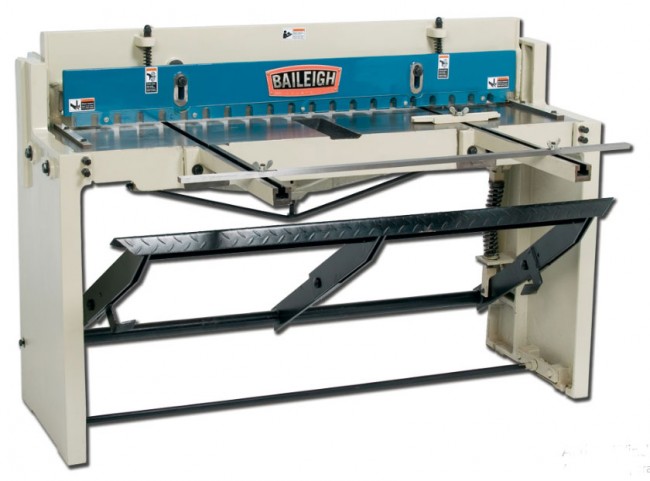 - Cisaille Baileigh livrée avec une table usinée, des supports de chargement et déchargement de tôles ainsi qu'avec des guides latéraux
