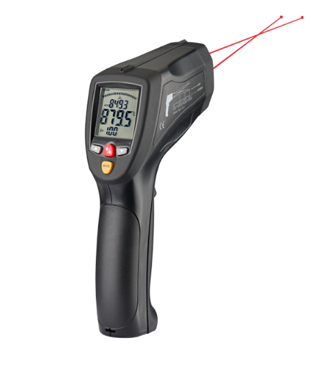 Pistolet infra rouge à émissivité réglable grâce à son double laser pour une mesure optimale au point de convergence et d'une alarme de température en cas de dépassement de seuil .