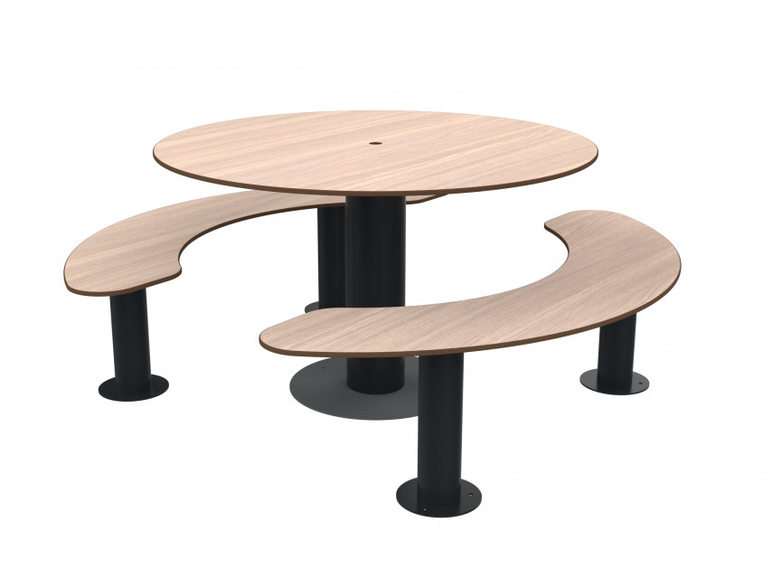 table pique-nique ronde avec assises séparées en acier et bois en compact HPL allie robustesse, design et confort d’utilisation.