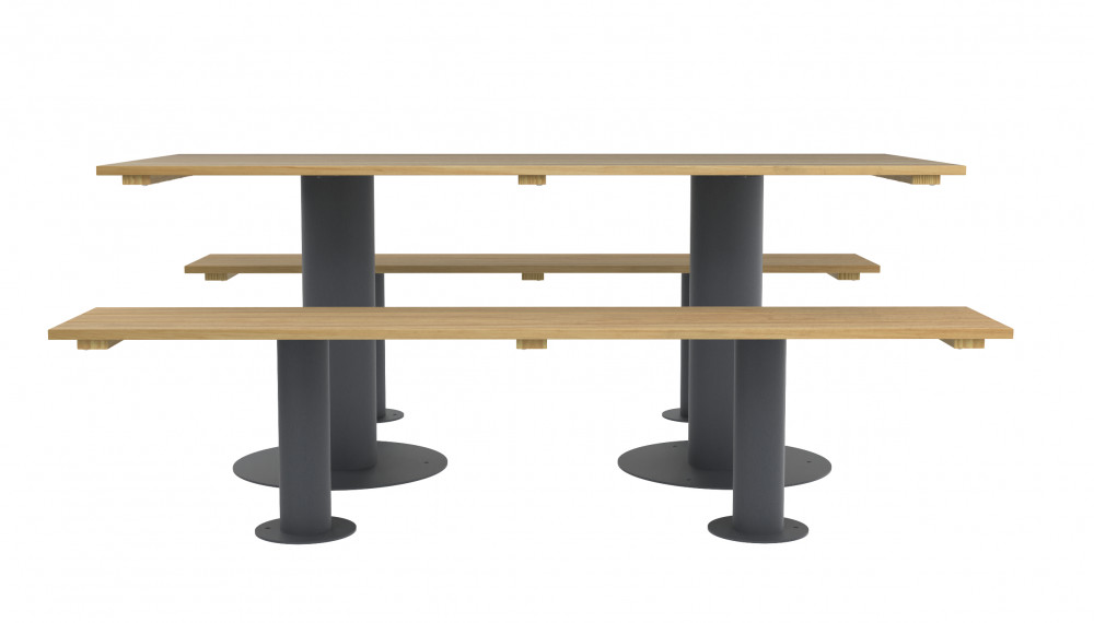 L’espace libre sous les bancs et la hauteur ergonomique de l’assise améliorent le confort d’utilisation, que ce soit pour de courts temps de pause ou des repas prolongés.