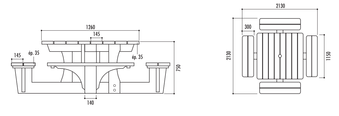 - Piètements du plateau en lamellé-collé de 140 x 140 mm, ép. 4,5 cm, les 4 pieds support plateau section 145 x 68 mm