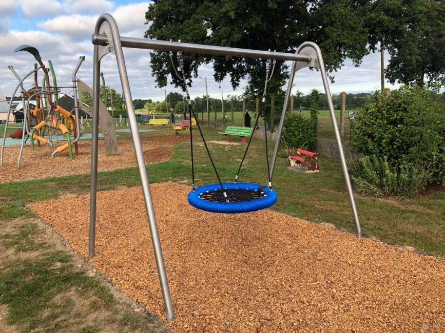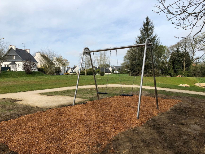 La balançoire double en acier inoxydable est conçue pour offrir des moments de plaisir à deux enfants simultanément.
