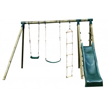 Ce portique est composé de 3 éléments : Une échelle - 2 balançoires - 1 Toboggan, avec accessoires et kit d'ancrage inclus.