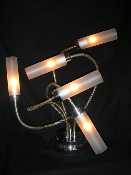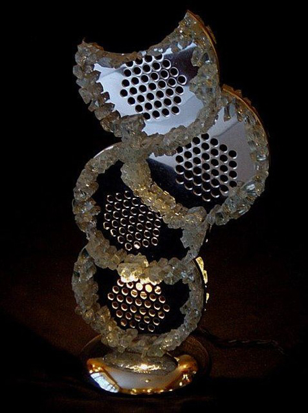 Matériaux pour partie éclairante : intérieurs de cendriers en chrome bordés de bris d'abribus en verre Securit blanc.