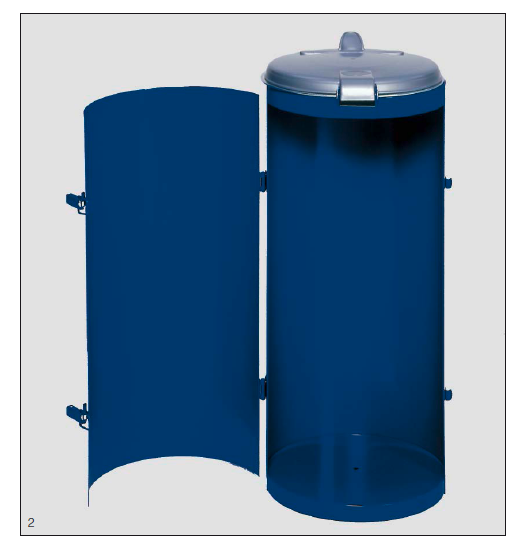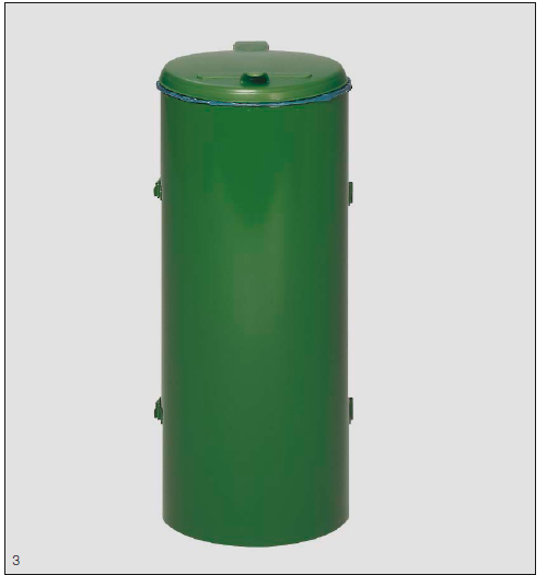 Le socle est muni de perforations pour ancrage au sol. Changement facile des sacs-poubelle par anneau de serrage.