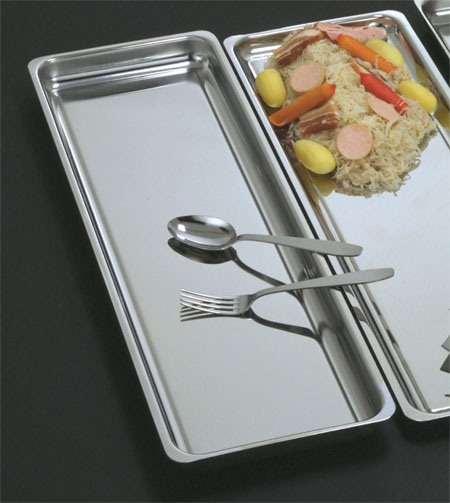 Ce plat rectangulaire en inox est idéal pour les vitrines réfrigérées.