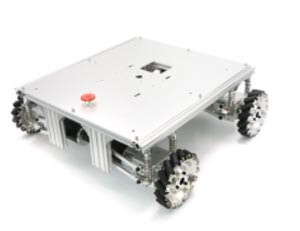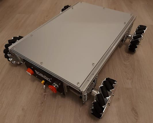 Base roulante puissante équipée de 4 moteurs 24V 100W montées sur suspensions indépendantes permettant de garder une bonne répartition de la charge sur les 4 roues mecanum qui restent ainsi tout le temps en contact avec le sol même sur des terrains non plat, améliorant ainsi grandement la qualité du déplacement.