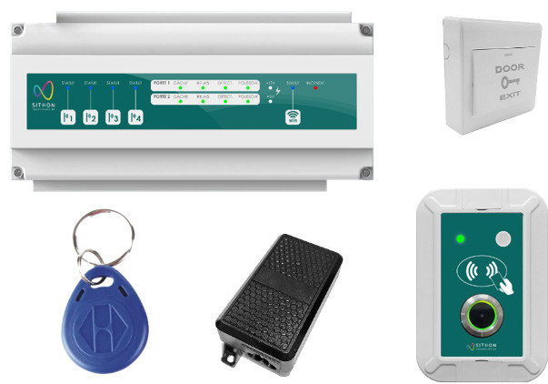 Cette solution est composée d'un contrôleur central, qui permet de piloter l'ouverture d'une ou de deux portes d'entrée (option), d'un ou plusieurs terminaux de lecture, et d'un portail de gestion en ligne.